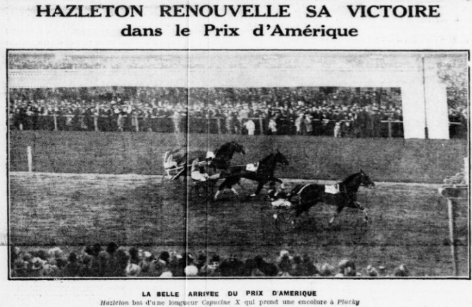 In 1931, at age 8, Hazleton became the first non-French horse to win the Prix d’Amerique, a win he repeated the following year. At 11 he was second to Walter Dear and at 12 finished third behind Muscletone and Calumet Guy in the big race.